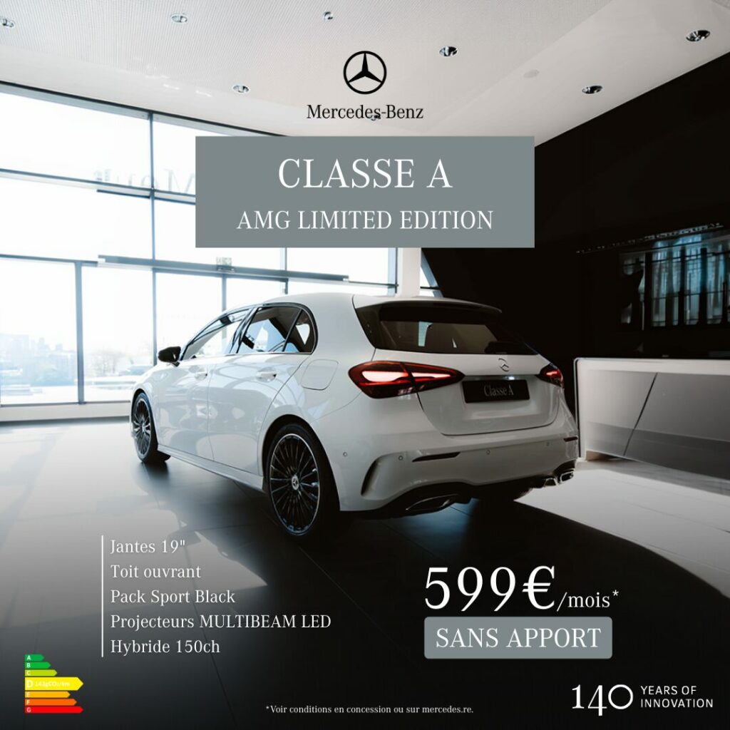 *Exemple pour une location longue durée d’une Classe A 180 AMG Limited Edition pour une durée de 60 mois et 40 000 km avant le 28 février 2026 hors carte grise et malus. Consommation en cycle mixte (l/100km) : 6.2 – Emissions de CO2 en cycle mixte WLTP (g/km) : 140. Offre non cumulable. Dans la limite des stocks disponibles. Réservé aux particuliers dans le réseau. Sous réserve d’étude et d’acceptation par CREDIT MODERNE OCEAN INDIEN.