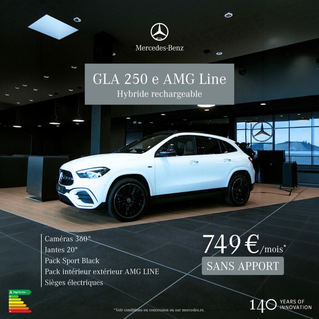 *Exemple pour une location longue durée d’un GLA AMG Line 250e pour une durée de 60 mois et 50 000 km avant le 28 février 2026 hors carte grise et malus. Consommation en cycle mixte (l/100km) : 3.1 – Emissions de CO2 en cycle mixte WLTP (g/km) : 25 – 27. Offre non cumulable. Dans la limite des stocks disponibles. Réservé aux particuliers dans le réseau. Sous réserve d’étude et d’acceptation par CREDIT MODERNE OCEAN INDIEN.